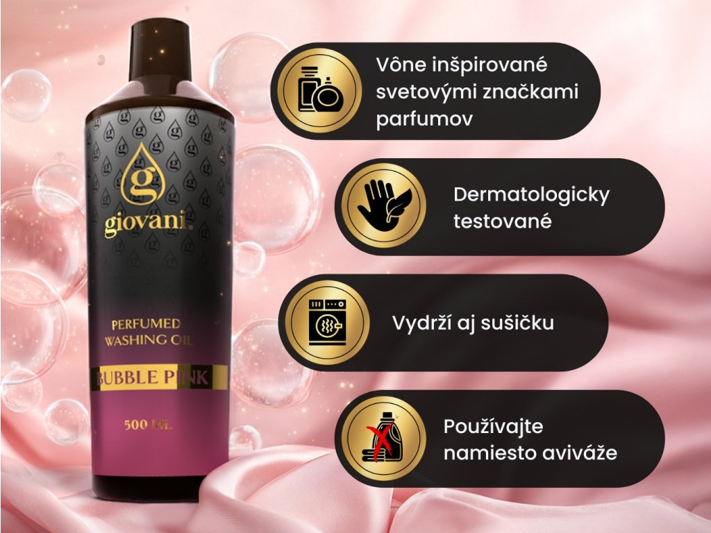 Objavte neodolateľnú sladkosť s Bubble Pink, očarujúcim parfémom na pranie od Giovani®. Jeho jedinečná kombinácia sladkých esencií vytvára intenzívnu a dlhotrvajúcu vôňu, ktorá zahalí vašu bielizeň do neodolateľnej arómy.