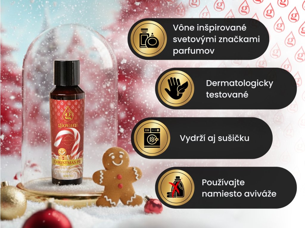 Predstavte si vôňu Vianoc a atmosféru, ktorú je cítiť vo vzduchu. Vianočná edícia parfému na pranie Giovani® CHRISTMAS PIE zahalí vašu bielizeň a domácnosť po každom praní do sviatočnej atmosféry, ktorá bude pretrvávať aj týždne.