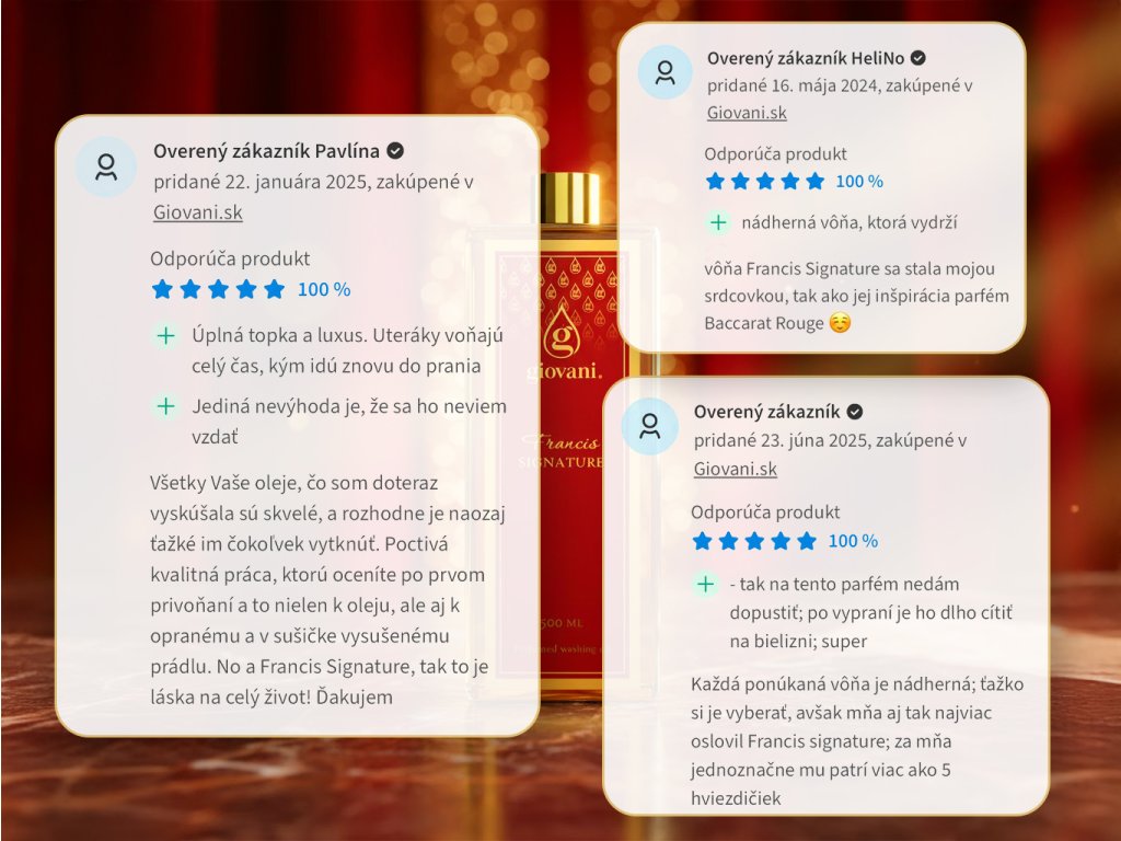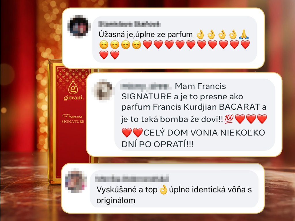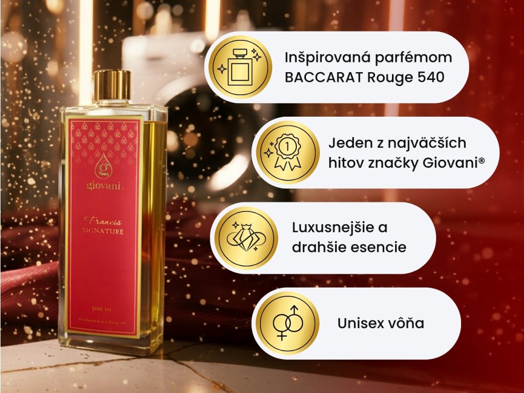Predstavte si palác zdobený zlatom a červeným zamatom s krištáľovo lesklými oknami tiahnucimi sa po celej dĺžke stien. Vzduch je presiaknutý jemnou vôňou čerstvej mandarínky, lahodnými tónmi jazmínu a karamelu, miešaný s dotykom drevených esencií. Práve takú atmosféru vám navodí Francis Signature, nový exkluzívny parfém na pranie značky Giovani®.