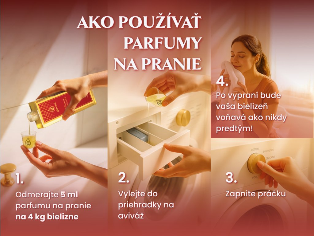 Použitie: Nalejte 7 ml koncentrátu do nádoby na aviváž. Toto množstvo predstavuje jednu dávku pre 4 kg bielizne. Koncentrát sa neriedi. Na dávkovanie môžete použiť vrchnáčik z parfému Giovani®, ktorý zodpovedá 4 ml, odporúčame aplikovať 2 dávky vrchnáčiku. Pre komfortné dávkovanie si môžete zakúpiť odmerku s naším logom alebo dávkovaciu pumpičku. Stačí použiť malé množstvo parfému a vaša bielizeň bude dokonale voňavá!