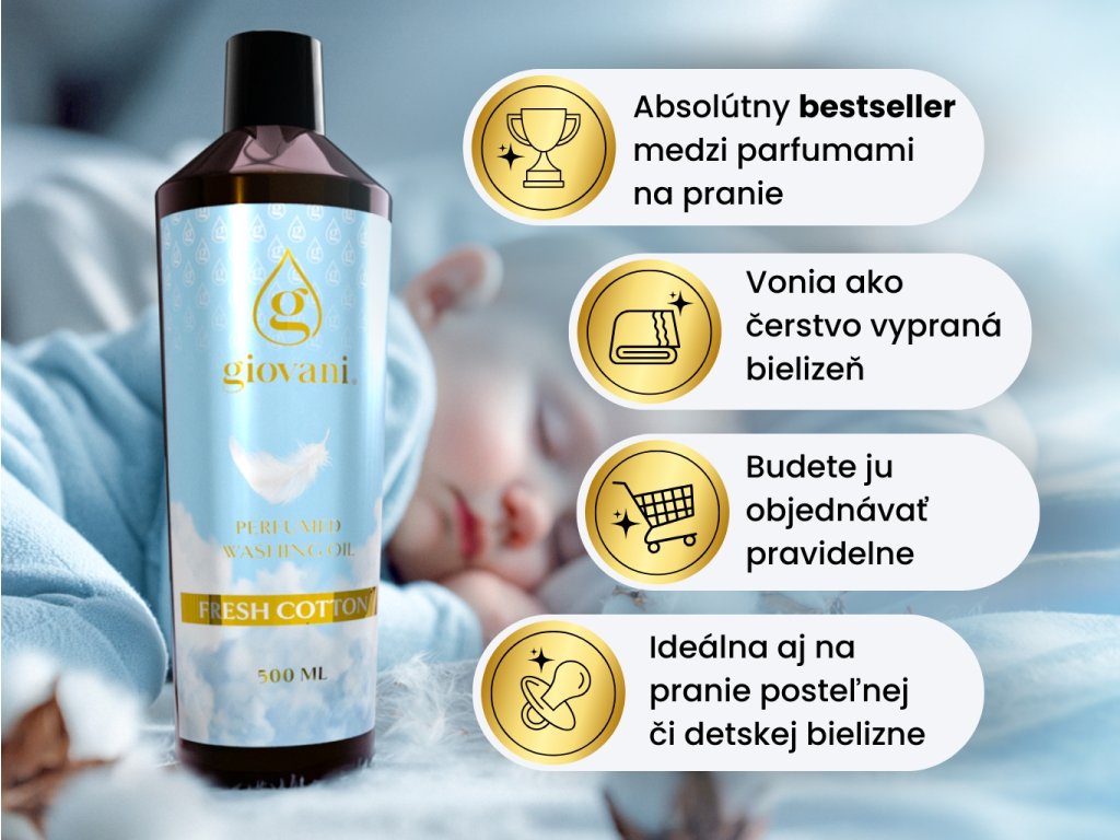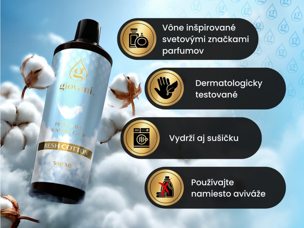 Vonné esencie oleja na pranie Giovani® Fresh Cotton vykresľujú jeho špecifický charakter. Sladko-svieža konvalinka prinesie do vášho domova pocit jari. Fialka dodá bielizni čistú a sviežu arómu. Elegantný jazmín vás spolu s ružou očarí luxusným a sofistikovaným nádychom. Srdce vône je obohatené o teplé tonkové bôby a sladký marcipán. Základ dotvorí krémová vanilka, mošus a exotické labdanum.