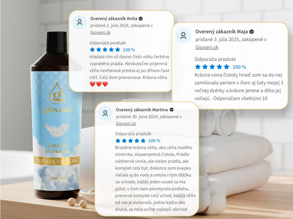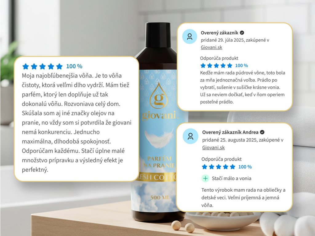 Giovani® je exkluzívna a luxusná značka parfémov na pranie. Na ich vysokej kvalite sme si dali veľmi záležať. Pri vývoji týchto vôní bolo pre nás dôležité dosiahnuť ich silnú intenzitu a dlhú trvácnosť, aby sme mohli o Giovani® hovoriť ako o tej najkvalitnejšej značke parfémov na pranie na trhu. Ich veľkou výhodou je, že nezanášajú práčku, nezanechávajú mazľavý povlak a škvrny na oblečení. Vďaka obsahu niektorých látok sa naše oleje starajú aj o farbu vašej bielizne. Sú vegánske, neobsahujú dioxán, chlorán sodný, SVHC, parabény, PBT/vPvB látky, ťažké kovy, tenzidy, znečisťujúce reziduá, mikroplasty ani nanolátky. Výnimočnosť značke Giovani® pridáva aj jej luxusný dizajn. Pýšiť sa môžeme aj dodaním do 24 hodín a rýchlym zákazníckym servisom. |