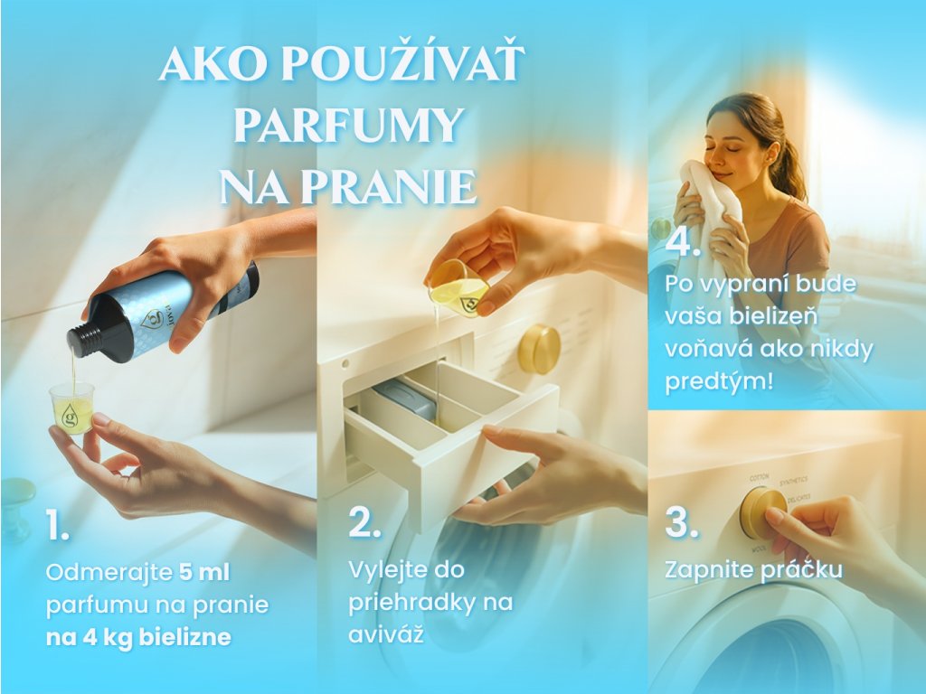 Vytvorili sme pre vás veľmi žiadanú verziu parfumu na pranie. Jeho vôňa sa dá charakterizovať, ako vôňa čerstvo vypranej bielizne. Ide o ľahkú arómu s púdrovými a sviežimi tónmi, ktorá je veľmi vhodná napríklad aj na pranie posteľnej bielizne či oblečenia pre malé deti.