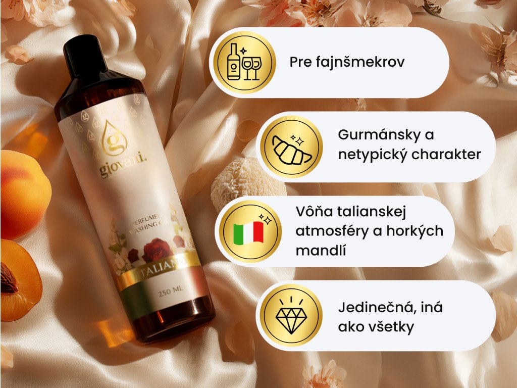 GURMÁNSKY CHARAKTER Sladké, kvetinové a gurmánske tóny sú spojené do jedinečnej harmónie. Parfém Italiano sa preto stane vašou obľúbenou vôňou pre bielizeň. |
