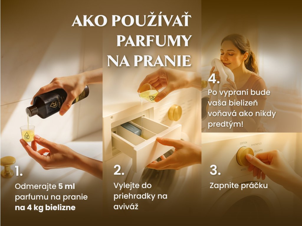 Parfémy na pranie nelejte do bubna práčky ani do sušičky. Sú priamo určené na použitie do nádobky na aviváž. Nemusíte sa obávať, že bielizeň stratí svoju vôňu po osušení v sušičke. Parfémy Giovani® sú odolné voči externým vplyvom a trvácne. Opratá bielizeň bude voňať aj po použití sušičky. Optimálna teplota na skladovanie olejov na pranie je približne 15-25 stupňov Celzia.
