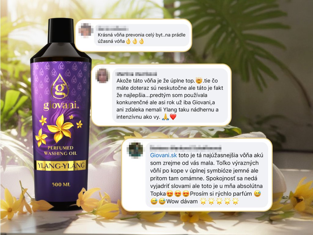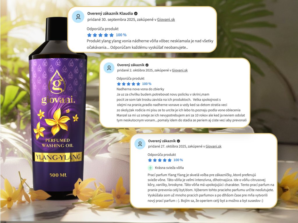Giovani® je exkluzívna a luxusná značka parfémov na pranie. Na ich vysokej kvalite sme si dali veľmi záležať. Pri vývoji týchto vôní bolo pre nás dôležité dosiahnuť ich silnú intenzitu a dlhú trvácnosť, aby sme mohli o Giovani® hovoriť ako o tej najkvalitnejšej značke parfémov na pranie na trhu. Ich veľkou výhodou je, že nezanášajú práčku, nezanechávajú mazľavý povlak a škvrny na oblečení. Vďaka obsahu niektorých látok sa naše oleje starajú aj o farbu vašej bielizne. Sú vegánske, neobsahujú dioxán, chlorán sodný, SVHC, parabény, PBT/vPvB látky, ťažké kovy, tenzidy, znečisťujúce reziduá, mikroplasty ani nanolátky. Výnimočnosť značke Giovani® pridáva aj jej luxusný dizajn. Pýšiť sa môžeme aj dodaním do 24 hodín a rýchlym zákazníckym servisom. |